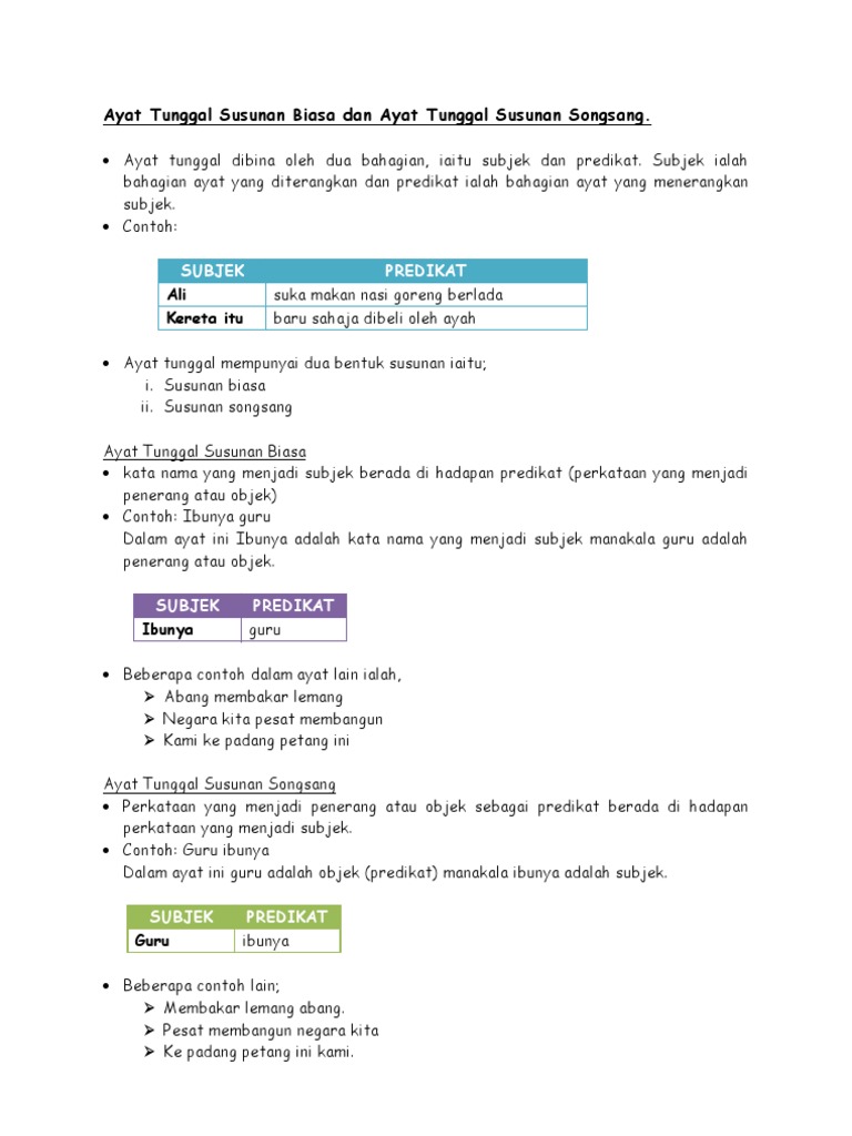 Ayat Susunan Biasa Kepada Ayat Songsang. You have just read the article entitled Ayat Tunggal Susunan Biasa. Ayat tunggal dibina oleh dua bahagian iaitu subjek dan predikat.